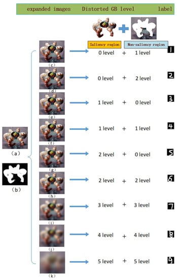 On the one hand, the characteristics of the large-scale expansion strategy are as follows: the time-consuming psychometric approach is not employed to obtain subjective score labels, and each distorted image derived from a given image by applying a given type of distortion has only a simple numerical label that represents its level of quality. On the other hand, Section 2.1 shows that the influences of salient and nonsalient regions on quality are quite different. Based on the two considerations above, we are inspired to introduce saliency into an expanded dataset in the form of regional distortion. We can generate multiple distorted images by adding distortion to high-resolution reference images. Among these distorted images, some will be subjected to global distortion of the original images, some will be distorted only in the salient regions of the reference images, and others will be distorted only in the nonsalient regions. Because the locality of the distortion (both regional and global) in the extended set of distorted images will be different, these images will have different perceptual qualities. Next, instead of asking volunteers to provide subjective scores, we can sort the distorted images based on their information entropy and assign simple numerical labels that represent their quality ranking. In this way, the combined effects of both saliency and distortion on quality will be reflected in the expanded dataset.