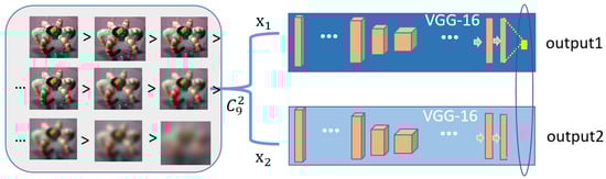 Pretraining process. The left side presents a series of distorted images of decreasing quality in the same group, and the right side presents a two-branch VGG-16 network where the two branches share parameters and a loss function.