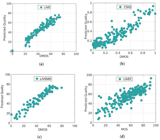 Scatter plots of the quality scores predicted by our method versus the ground-truth subjective DMOSs/MOSs for four datasets: (a) LIVE; (b) CSIQ; (c) LIVE MD; (d) LIVEC.