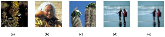 The output of our pretrained model is not a direct image quality score. Only when multiple different images are input and their output values are obtained can the order of these values reflect the quality ranking of the images. To further evaluate the contribution of our expanded dataset and more accurately evaluate the contribution of the incorporation of saliency during the pretraining stage, we applied our pretrained model to various images and compared its predicted outputs to evaluate whether it could precisely rank images by quality. We compared our model with the pretrained RankIQA model, for which only images with whole-region distortion are considered during pretraining. Five image examples from the CSIQ database are shown in Figure 9, and in Table 5, we show the ground-truth label ranking, the order of the output of the pretrained RankIQA model, and the order of the output of our pretrained model for these images. We can see that RankIQA can accurately sort images (d) and (e), which contain whole-region distortion, but fails on images (a) and (c), which have clear foregrounds but blurred backgrounds accounting for nearly half of the entire image. By contrast, after only pretraining on the expanded dataset, our model fully reflects the joint influence of saliency and distortion and thus can perform well on images with both whole-region distortion and only local-region distortion, as is particularly evident from its performance on (a) and (c). We can see that the distortion level in the foreground in (c) is larger than that in (a), but the overall distortion of (c) is less than that of (a) when the entire image is considered. RankIQA [] will tend to output a better quality score for (c) because the RankIQA model has only “distortion-level” awareness during training; it considers all regions equally in the final prediction. However, because our pretrained model has saliency awareness, it can sort the images correctly, as expected; therefore, our expanded database, which is based on both saliency and distortion and guided by information entropy, is more “similar” to the IQA database and can thus provide more effective assistance for the IQA task.