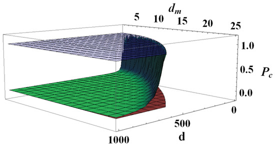 (Color online) Purity threshold given in Equation (21) (green surface) and natural purity limits 1 (blue upper surface) and (red lower surface) as functions of and such that . Values of purity below the green surface are such that , while values of purity above the green surface yield . It is clear that when , , meaning that for most quantum states. On the other hand, when and almost everywhere in state space.