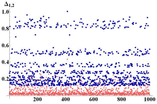 (Color online) (light red triangles) and (dark blue circles) evaluated for 1000 randomly generated bipartite states, with randomly chosen in [2, 10]. For these perfectly balanced bipartite states everywhere in state space.
