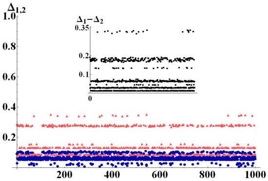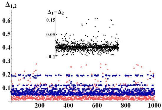 (Color online) (light red triangles) and (dark blue circles) evaluated for 1000 randomly generated bipartite states, with and randomly chosen in [2, 10]. Since the bipartitions are no longer perfectly balanced, there is a much broader mixing of values of and . In particular, has a much wider distribution of values, while seems to have a much denser distribution around central values. The inset shows the difference .