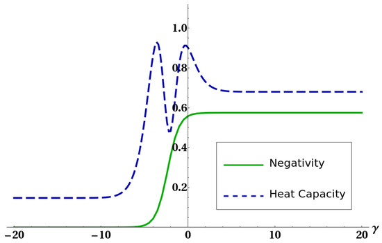 where is the spin operator of the i-th particle, , and are real interaction parameters. This effective Hamiltonian operator describes a system consisting of two ultracold atoms (spins labeled as 1 and 2) in a two-well optical lattice and in the Mott insulator phase, where thus the tunneling term in the usual Bose–Hubbard picture is accounted for as a second-order perturbative term, both coupled with a third atom (labeled as 0) via a Heisenberg-like interaction. An external magnetic field is also present, uniformly coupled to the three atoms. Such a system is a generalization of the one studied in [], where a deep connection between thermal entanglement and heat capacity in parameter space has been shown. Hamiltonian (25) is analytically diagonalizable, thus allowing us to obtain explicit expressions for thermodynamic quantities characterizing the Gibbs equilibrium state of the three-atom system, together with the negativity of the reduced state of the two quadratically coupled spins.