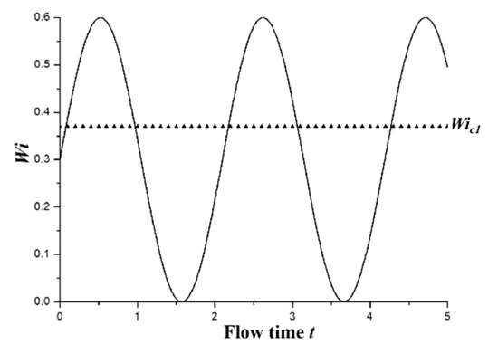 where u is the instantaneous velocity component in X direction, A is the amplitude to measure the degree of pulsation of external stimulation and f0 is the external stimulation frequency. The parameters of the sinusoidal signal at the inlets are shown in Table 1. These parameters are specially chosen to make sure that the flow condition will cross the first critical Wi number Wic1 periodically, as shown in Figure 2, so that the impact of different stimulations on the flow patterns can be investigated. To avoid misunderstanding, it is worthy to point out that Wi can be defined based on the time-averaged mean velocity (which is Wim) and the time-dependent mean velocity u (Wi), respectively, for the viscoelastic fluid flow under an external stimulation. Therefore, the value of Wim is 0.3 for different external stimulation frequencies.