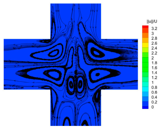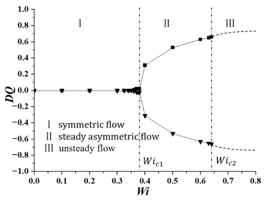 The classical pitchfork bifurcation trend of DQ changing with Wi is plotted in Figure 4. Figure 5 shows the velocity contours and superimposed streamlines at typical Wi numbers in the corresponding flow regions. It can be seen that the change of DQ with Wi has three typical characteristics. (1) When Wi is small enough, the flow pattern is completely symmetric, and the value of DQ is 0. (2) With Wi increasing, the flow pattern changes from symmetric flow to steady asymmetric flow, and the first critical Wi number Wic1 is 0.370 (square root fit, DQ , where B = 1.30), which is close to the result of 0.363 [25]. (3) With Wi further increasing, the flow pattern becomes time-dependent. The second critical Wi number Wic2 is determined by the boundary and the flow in two sides of which are steady asymmetric state and time-dependent state. The value of Wic2 is 0.645, which is slightly larger than the study of Cruz et al. [25], 0.425. Many different aspects may affect the difference of the results, such as the total number of mesh nodes, discretization method for different terms in governing equations, numerical method to solve the system of differential equations. Besides, the viscosity ratio in our study and theirs are 0.1 and 1/9, which may be another one of the reasons to explain the differences between the results.