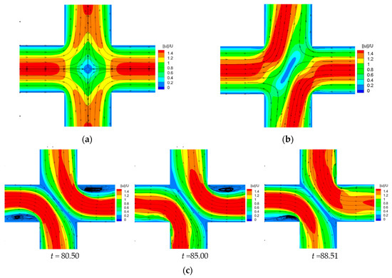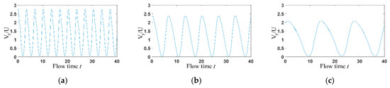 The transient velocity at (0, w) is selected for the statistical analysis of the flow field. In the microchannel, the inertial effect of the flow can be neglected. When the velocity is constant at inlets, it can be seen from Figure 9 that the flow is steady (steady symmetric flow and steady asymmetric flow) with Wi lower than the Wic2, but shows a strong pulsation when elastic effect is strong enough (Figure 9c), indicating that elastic turbulence occurs at this time. However, when sinusoidal varying velocity is applied at channel inlets, Figure 10 presents that velocity at (x, y) = (0, w) changes sinusoidally with time.