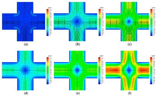 When sinusoidal varying velocity is applied at the channel inlets, the Wi of viscoelastic fluid changes from nearly 0 to 0.6 in one external stimulation cycle, and the change range covers two flow regimes under the constant inlet velocity condition. At this time, the expected flow pattern may be the same as that without stimulation, i.e., two flow patterns may occur successively. However, as shown in Figure 6, the flow states are all symmetric at both different Wi numbers and external stimulation frequencies.