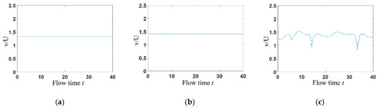 Time domain diagram of transient velocity at (x, y) = (0, w) without stimulation. (a) Wi = 0.3; (b) Wi = 0.4; (c) Wi = 2.