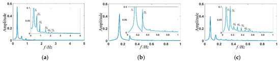 Amplitude spectrum of transient velocity at (x, y) = (0, w) with sinusoidal stimulation. (a) f0 = 0.296 Hz; (b) f0 = 0.149 Hz; (c) f0 = 0.074 Hz.