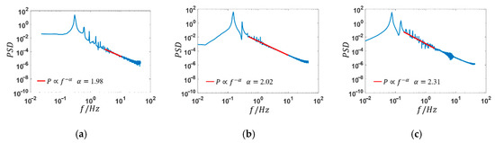 The power spectrum density (PSD) of instantaneous velocity, as shown in Figure 13, satisfies the law of exponential decay () in at least two orders of magnitude with the change of frequency, and the decay exponents are −2.31, −2.02, and −1.98 corresponding to different external stimulation frequencies. The results are qualitatively consistent with the findings obtained by Sousa et al. [35], whose studies showed that the velocity power spectra exponent of elastic turbulence in a microfluidic cross-slot device is between −2 and −4.