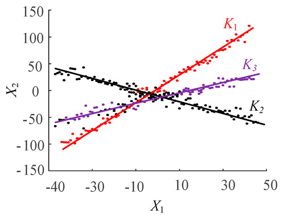From Equation (8), the sparse transform does not change the mixing matrix A. After the thinning process, the source signal became S(D−1)T and the observed signal became X(D−1)T. Then the sparse signal is linearly clustered, and the mixing matrix A can be obtained by calculating the slope of the line.