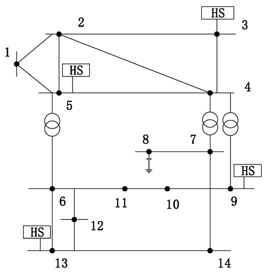 In order to verify the effectiveness of the proposed method, an IEEE 14-node system was selected for simulation. As shown in Figure 2, there are 4 Harmonic Sources (HS) in the simulation, which are located at nodes 3, 5, 9, and 13 respectively. The harmonic current adopts the 5th and 7th harmonic typical curves [27], which have a total of 1000 sampling points and are superimposed with a random disturbance of ±5% on the source signal. Under the condition that the system network topology and system impedance are unknown, the proposed algorithm is analyzed.