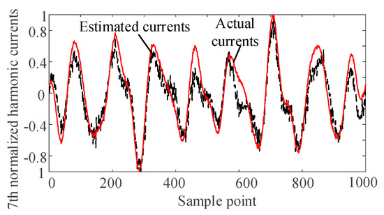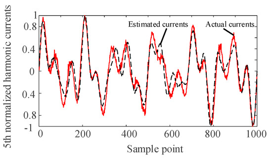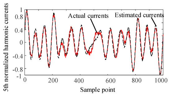 Normalized estimated harmonic current and actual harmonic current at injection node 2.