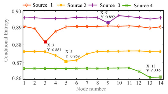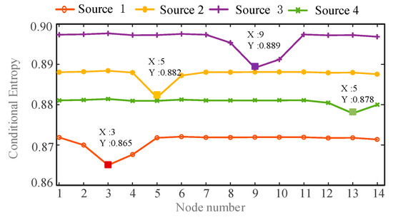 The stronger the interdependence between two random variables, the smaller their conditional entropy. Due to the shunting effect of the power system, the correlation between the harmonic current and the harmonic voltage of the injection node is higher than that of the non-injected node [9,10], which has the minimum conditional entropy. Therefore, by comparing the conditional entropy of all nodes in the system, the location of the harmonic source can be identified.