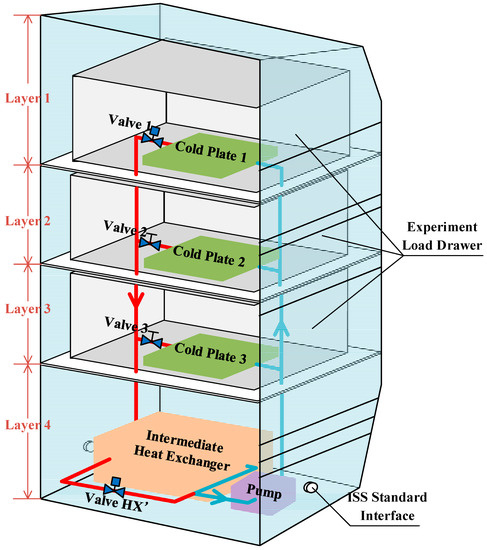Standard interface racks are designed around the concept of providing a set of common interfaces for modular experiments [4]. Expedite the Processing of Experiments to Space Station (EXPRESS) racks are the most widely used SIR, and provide accommodation and facilitates operations for microgravity-based research payloads on the ISS [5]. There have been many space experiments conducted in EXPRESS racks and similar racks, such as the European Drawer Rack (EDR), which aids with biological experiments, human physiology and adaptation experiments, and physical science experiments [1]. The EXPRESS rack can accommodate eight single middeck lockers and two international subrack interface standard drawers, and in order to realize the thermal control of payloads, a defined Active Thermal Control System (ATCS) Kit has been developed. The ATCS consists of a set of cold plates, some with a heat exchanger, and it provides a mechanism for transporting the heat load generated by the experiments to Internal Thermal Control System (ITCS) loops [6]. The payloads are in parallel or series connection in the thermal control fluid loop system. Each payload rack is connected to the ITCS, which can supply cooling fluid at 15.6 to 18.3 °C [7] via a permanently installed kit by flex hose assemblies [6], and the racks are in parallel connection with each other. Generally, the coolant flow of the ITCS loops flows into the payloads in the rack directly, and the flowrate is regulated by a Rack Flow Control Assembly (RFCA), which includes a modulating valve, a flow sensor, and a temperature sensor. The RFCA is located on the outlet line of the payload rack to maintain either a specific flow rate or a specific outlet temperature as determined by the user [7], which can realize the thermal control of the rack overall. Owing to the fact that the RFCA cannot control the flowrate of the cold plate branches, the temperature control of experimental payloads requires other accessories, including thermoelectric coolers (TECs), heaters, and fans, etc. In a few applications a heat exchanger is mounted within the experiment facility rack. Each side of the heat exchanger accommodates only one single loop flow, with the ITCS side being designated the cold side and the experiment rack the hot side [6,8].