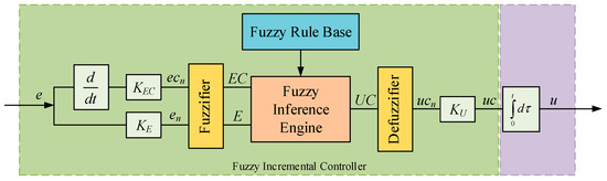 In this paper, fuzzy incremental control is employed in the two controllers of the fluid loop system. Fuzzy incremental control is an improved control mode based on traditional fuzzy control, which is mainly aimed at practical problems such as the existence of steady state control residuals and the difficulty of controllers adapting to change in control object parameters [25]. Moreover, the output of the fuzzy control is the increment of the control variable, which can be the final control variable by integration. It can not only eliminate the error but also improve the reliability of the control algorithm. A structure chart of the fuzzy incremental controller is presented in Figure 3. It consists of four main parts, namely, the fuzzifier, fuzzy rule base, fuzzy inference engine, and defuzzifier. KE and KEC are the quantization factors of error and error change, respectively. ecn and en are the quantized inputs. E and EC are the fuzzy sets of the inputs. UC is the fuzzy set of the output. ucn is a dimensionless output of the increment of the control variable. KU is the proportionality coefficient of the output. uc is the increment of the control variable. u is the control variable. As mentioned above, the input of the controller is the temperature error and the output can be the pump speed or the opening of the electric regulating valve.