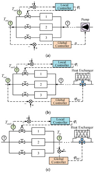 Three control strategies with different inputs and outputs. (a) The control variable is the pump speed and the controlled variable is . (b) The control variable is the valve opening of the bypass of the heat exchanger and the controlled variable is . (c) The control variable is the valve opening of the bypass of the heat exchanger and the controlled variable is .