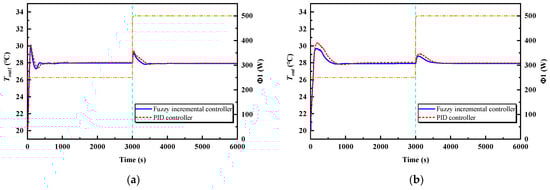 In order to verify the effectiveness of the fuzzy incremental controller and reflect on its advantages, the fuzzy incremental controller is first compared with the PID. The two controllers are, respectively, employed in case 1, in which the controlled variable is the outlet temperature of the cold plate branch and the control variable is the pump speed . The other simulation parameters are shown in Table 6.