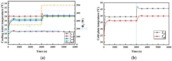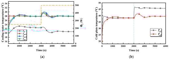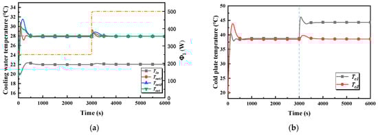 The inlet and the outlet temperature of the cold plate branch and the outlet temperature of the cold plates are the main concerns of case 2, as is shown in Figure 10a. In stage one, all the temperatures rise rapidly and tend towards stability after about 2000 s under the action of the controller. The maximum value of the outlet temperature of the cold plate branch, which is the controlled variable in the global controller, is 28.5 °C, which means that the overshoot is tiny and is merely around 0.5 °C. The maximum values of the outlet temperature of the two cold plates are 28.5 °C and 28.7 °C, respectively. However, it is obvious that the settling time of the outlet temperature of cold plate 1 is shorter, being about 200 s. By contrast, cold plate 2, which is without the local controller, takes about 2000 s to get the same state. The inlet temperature of the cold plate branch is maintained at about 22.5 °C after 2000 s. In stage two, the heating power of cold plate 1 jumps from 250 W to 500 W, which causes the outlet temperature of cold plate 1 to rise rapidly; its maximum is 29.7 °C, which means its overshoot is 1.7 °C. The settling time is 1500 s. The outlet temperature of cold plate 2 and the cold plate branch increase and reach stability after 1500 s. Their maxima are, respectively, 30 °C and 29.6 °C. In addition, there is a decrease in the inlet temperature of the cold plate branch, which is maintained at about 20.7 °C after 1500 s.