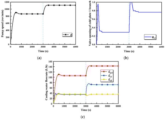 Main causes for the occurrence of the said phenomena can be explained by the variations in pump speed, the valve openings of cold plate branches, and the flowrate, which are shown in Figure 9. In stage one, the pump speed rapidly increases, which leads to an increase in the total flowrate of the loop. The valve opening of the cold plate 1 branch also rapidly increases, and with the effect of these two aspects, the flowrate of the cold plate 1 branch increases much faster than that of the cold plate 2 branch. As can be seen from Figure 9c, the flowrate of the cold plate 1 branch reaches a stable range after 200 s, but the cold plate 2 branch takes about 400 s to do so. Accordingly, the responses of cold plate 1’s relevant temperatures are faster than those of cold plate 2. In stage two, the valve opening of the cold plate 1 branch rapidly increases, resulting in a sharp increase in the flowrate of the cold plate 1 branch, which also leads to a decrease in the flowrate of the cold plate 2 branch. As a result, the temperature of cold plate 1 overshoots over a period of time.