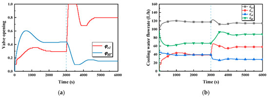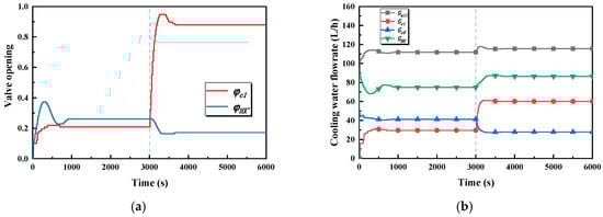The main causes for the occurrence of the said phenomena in case 2 can be explained by the variations of the bypass valve opening of the intermediate heat exchanger, the valve openings of the cold plate branches, and the flowrate, which are shown in Figure 11. In stage one, the bypass valve opening of the heat exchanger increases because the outlet temperature of the cold plate branch is temporarily lower than the set temperature, which leads to a decrease in the flowrate through the hot side of the heat exchanger. The valve opening of the cold plate 1 branch increases, which leads to the flowrate of cold plate 1 branch increasing and for the flowrate of cold plate 2 branch to experience a relatively small decrease. That is to say, the change trends of the flowrate of the two plate branches are the opposite of one another. Hence, the outlet temperature of cold plate 1 and its temperature respond faster because the flowrate of the branch is small at the beginning. The flowrates of the two cold plate branches are, respectively, 38.7 kg/h and 39.4 kg/h after reaching a stable state result in the outlet temperature of the two cold plate branches, and the two cold plate temperatures are almost the same. In stage two, the valve opening of the cold plate 1 branch rapidly increases, resulting in a sharp increase in the flowrate of the cold plate 1 branch, which also leads to a decrease in the flowrate of the cold plate 2 branch. As a result, the temperature of the two cold plates are increased. Additionally, the bypass valve opening of the heat exchanger is decreased, rapidly bringing about an increase in the flowrate through the hot side of the heat exchanger, increasing the heat exchange between the SWL and the PWL.
