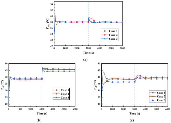 Temperature–time curves. (a) The outlet temperature of cold plate 1. (b) The temperature of cold plate 1. (c) The temperature of cold plate 2.