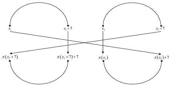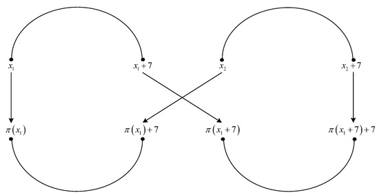From solutions of (28), (33), (45), and (46), it results that the interleaver pattern from Figure 1 always appears for or , when and . For an interleaver pattern as in Figure 1, the weight of the codeword for classical nominal 1/3 rate turbo codes with two RSC codes having generator matrix , is equal to , because each of the four error patterns with a weight of three leads to a parity weight of three, and each of the three error patterns with a weight of four leads to a parity weight of four. Because the interleaver pattern from Figure 1 always appears in the previous conditions, it results that the minimum distance is upper bounded by the value of 36. □