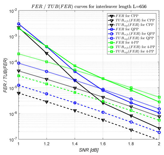 In Figure 4, the , , and curves for 4-PP, CPP, and QPP of interleaver length L = 656 are shown. The 4-PP and the CPP are those from Table 15, and the QPP is given in [21]. For curves, the Max-Log-MAP algorithm with a scaling coefficient of the extrinsec information of 0.75 was used. We note that the considered multiplicities for and curves are the estimated ones; i.e., , L, and , for 4-PP, CPP, and QPP, respectively. For , from Figure 4, it results that