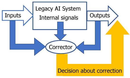A scheme of corrector. Corrector receives some input, internal, and output signals from the legacy artificial intelligence (AI) system and classifies the situation as ‘high risk’ or ‘normal’ one. For a high-risk situation, it sends the corrected output to users following the correction rules. The high risk/normal situation classifier is prepared by supervised training on situations with diagnosed errors (universal construction). The online training algorithm could be very simple like Fisher’s linear discriminants or their ensembles [30,39,40,43,44]. Correction rules for high-risk situations are specific to a particular problem.