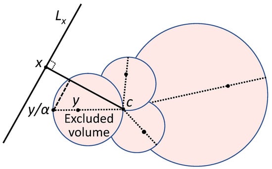 Fisher’s separability of a point from a set Y. Diameters of the filled balls (excluded volume) are the segments (). Point should not belong to the excluded volume to be separable from by the linear discriminant (1) with threshold . Here, is the origin (centre), and is the hyperplane. A point should not belong to the union of such balls (filled) for all for separability from a set Y. The volume of this union, , does not exceed .