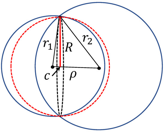 Measure of clustering quality. Intersection of two balls with the radii , and the distance between centres is included in a ball with radius R (4) and centre c (colored in red).