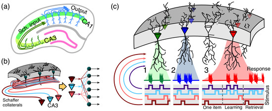 Organisation of encoding memories by single neurons in laminar structures: (a) laminar organization of the CA3 and CA1 areas in the hippocampus facilitates multiple parallel synaptic contacts between neurons in these areas by means of Schaffer collaterals; (b) axons from CA3 pyramidal neurons bifurcate and pass through the CA1 area in parallel (left) giving rise to the convergence-divergence of the information content (right). Multiple CA1 neurons receive multiple synaptic contacts from CA3 neurons; (c) schematic representation of three memory encoding schemes: (1) selectivity. A neuron (shown in green) receives inputs from multiple presynaptic cells that code different information items. It detects (responds to) only one stimulus (purple trace), whereas rejecting the others; (2) clustering. Similar to 1, but now a neuron (shown in blue) detects a group of stimuli (purple and blue traces) and ignores the others; (3) acquiring memories. A neuron (shown in red) learns dynamically a new memory item (blue trace) by associating it with a known one (purple trace). ((Figure 13, [40]), published under CC BY-NC-ND 4.0 license.).