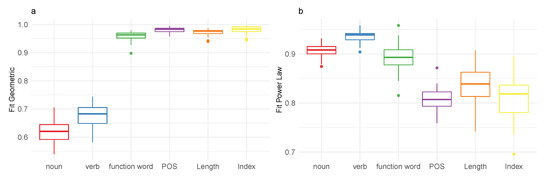 Boxplots of fits to geometric distribution (a,c) and power law distribution (b,d) for categories analyzed in Section 3.1 and Section 3.2 for the first 2500 words by 40 speakers (a,b) for 40 random samples ranging in sizes between 652–19,363 (c,d).