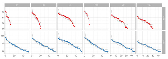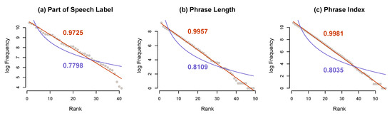 Figure 2a–c shows frequency rank distribution plots of log counts for part-of-speech labels, phrase lengths, and the phrase positions, respectively. The blue line indicates the best fit to log-log scale (power law), while the red line shows the best fit to geometric (geometric is linear; the probability decreases at a constant rate). As we can see, the empirical distribution (represented by the grey points) of part-of-speech labels, utterance length, and utterance position, with of , , and , respectively, show a close fit to geometric, whereas fits to power law are , , and , respectively.