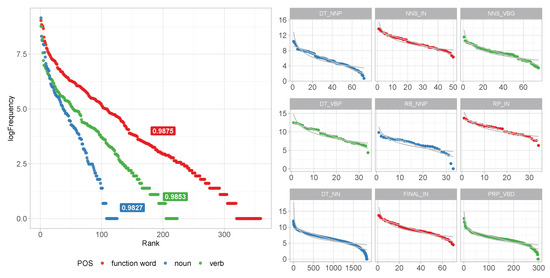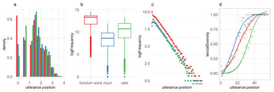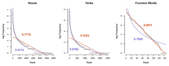 Importantly, previous studies have shown that token distributions in closed class categories (function words and modal verbs) do not follow power laws [43,44]. These departures from the trend to power law in other categories are assumed to be related to the communicative function of high-frequency words. Linguistic theories typically assume that closed class tokens serve a qualitatively different modifying or grammatical function while open classes are considered to contain and transport meanings; that is, they provide lexical contrast.