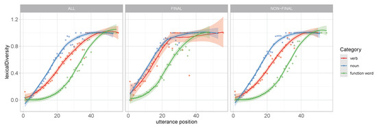 Accordingly, the distributional patterning of verbs thus appears to reduce uncertainty about not only the lexical properties of upcoming parts of a message but also its structure. In other words, because verbs take arguments, there ought to be less variance in their patterns of covariation and this ought to lead to less overall uncertainty in the context of verb arguments. Consistent with this, Seifart et al. [15] report that slower articulations and more disfluencies precede nouns than verbs across languages, raising further questions about the kind of information that is communicated by variational patterns in speech and, in particular, whether and to what degree, this kind of sublexical variance actually serves a communicative function.