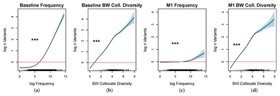 To explore the nonlinear effects of frequency and collocate diversity on observed variance, we fitted generalized additive mixed models (GAMM) [35] using the mgcv package for R. In baseline model 1, we model the normalized number of observed corpus variants as a function of the smooth over log frequency. In baseline model 2, we model the number of variants as a function of a smooth over collocate diversity, the log normalized number of preceding words we observe in the corpus.