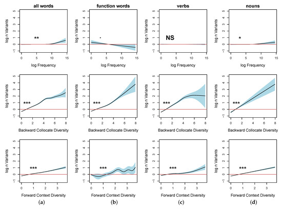 Log normalized number of observed variants as a function of smooth over log frequency (row 1) and adjacent token diversity (rows 2 and 3) for all words (a), function words (b), verbs (c), and nouns (d): when collocate diversity is taken into account, frequency effects on variation only hold in a minimal proportion of high-frequency nouns and appear to have no effect at all on verbs and function words.