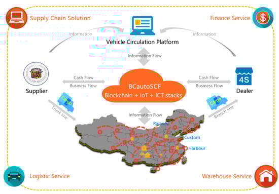 For the Auto retail industry, participants in the SC (e.g., manufacturers, suppliers, carriers, warehouse, terminal buyers, and funding providers, etc.) had limited peer-to-peer communication with regards to their own concerns in traditional setting []. One of the biggest hurdles in information exchange is the “trust”. In addition, there are high risks of tampering while involving in debit notes, contracts, and warehouse receipts. Actually, in a centralized information environment, it is easy to tamper a record []. Moreover, it is costly to perform efficient custody, especially difficult to verify the authenticity of an invoice/a receivable [,]. Contrarily, BCT promises honesty and allows secure authentication of logistics and information circulation in a SC network [,]. With the development of BCT, its applications in SC fields are rapidly emerging []. This paper implements a Blockchain-driven SCF platform, which aims to ensuring the trust among shareholders and reducing the financing cost for the Auto retailer industry.