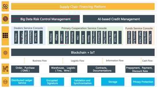 SCF integrates financing and risk mitigation techniques to enhance the supply chain process, reduce the operational cost, and monitor the floating risk. SCF is usually applied to open account transaction. The visibility and traceability of these underlying information flows among these finance parties is necessary for such financing arrangements [,]. The major forms of SCF include: (1) Factoring: An emerging comprehensive financial service, that consists of commercial credit information, trade finance, receivables, and credit risk deposits. It is a form of receivables purchase, where goods and services are sold at a discount price to a finance provider. (2) Order financing: A classical self-liquidating financing technique. (3) Inventory financing: A specific loan for fund inventory purchases, and the purchased inventory acts as collateral to secure the loan. Meanwhile, term loans or credit lines can also be used to purchase inventory. Nowadays, invoice-based financing takes the largest share (up to 90% market share), meanwhile, inventory financing and pre-shipment financing just take very limited market shares and are restricted to certain industries [].