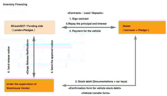 Researchers previously illustrated the methods and principles of using computational terms to describe the legal rules and the consequent structure of financial contracts []. Under this framework, Blockchain-driven smart contracts can ensure that logic is executed accurately between untrusted entities without modification by any parties. In this case, smart contracts are designed to automatically execute the state transition of the collaterals/documents/funding ownership among participants in SCF that encode explicit transition rules for shifting the ownership from one to another. Those states are triggered by the realization of certain predefined conditions, such as an event by other parties that may be within or out of their control (for instance “e-contract passed”, “invoice issued”, “vehicle delivered” or “instruction received”). Further, a smart contract can independently schedule various kinds of resources. Instantly, a typical smart contract is designated to raise funds by offering financial services or issuing digital equity. In a Blockchain network, a smart contract is self-executed throughout the whole peer network. According to literatures [,], a smart contract could work towards events outside a Blockchain and be applied to physical assets. In order to clearly explain how the key service (i.e., financing) operates, we hide some technical details and simplify the BCautoSCF financing steps to conclude the workflow as illustrated in Figure 5. Document flow could be processed by BCT, which will ensure the authenticity of documents. These vehicles are also uniquely identified, and submitted for the efficient custody, for instance automation program (i.e., smart contracts), that further guarantees that a payment will be handled when certain criterion is reached. In this way, the automatic custody could cause a positive result, such as mutual trust in a commercial relationship, more funds received, and lower transaction costs.