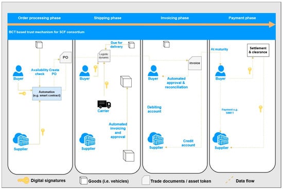 A SCF application is attractive and effective for its implementation based on two main baselines: (1) Information exchange is secure, verified, and trustable throughout the Blockchain in real time, so that all members of the supply network can access this information any instant. (2) Automatic validation and transaction execution can be implemented when certain criteria are triggered by a smart contract []. Driven by the BCT, the workflows in traditional SCF can be significantly refined: Smart contracts can react to SCF events and could be applied to physical assets (i.e., collaterals) represented outside a Blockchain (i.e., SC networks).