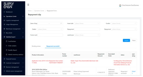 BCautoSCF offers equal visibility on transactions and collateral custody information to interested parties in the supply chain, and this offering is reliable, authentic, immutable, and verified only by the granted parties from the SCF consortium. By involving all participants of information and data flow into BCautoSCF and by issuing digitized documents, we can ensure all these activities and documents throughout the supply chain to be equally visible and available to every participant. Every interested party will be provided with information about whom, where, and when issued them or move the vehicles (as illustrated in Figure 6, Figure 7, Figure 8 and Figure 9). This decreases the need for face-to-face communication, avoids human operation errors, and ensures significantly faster transactions in SCF.