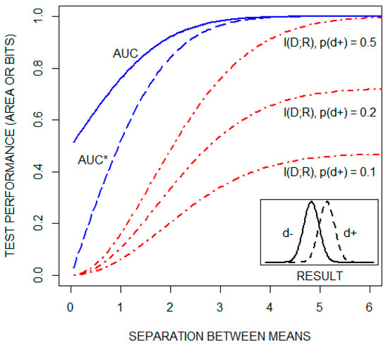 Most papers on the application of information theory to clinical diagnostic testing are founded upon a report published by Metz, Goodenough, and Rossmann in 1973 [4]. They derived the expression for the information content (mutual information) of a diagnostic test as a function of the pretest probability of disease and the test’s true positive rate (probability of a positive result given disease) and false positive rate (probability of a positive result given no disease), i.e., they used these parameters to calculate the posttest probability distribution and then used the pretest and posttest distributions to calculate mutual information. They applied the theory to the evaluation of radiographic systems and noted that this statistic can be used to compare points on the same or different receiver operating characteristic (ROC) curves (defined below in Section 6.1) [31]. The area under the ROC curve (AUC) is a popular measure of diagnostic test performance [32]. Relationships between the AUC and mutual information are discussed in the example presented in Section 6.1. Metz et al. also suggested that the performance of a diagnostic test be quantified as the maximum of the set of information contents associated with the points on a test’s ROC curve (. Subsequent authors suggested that can be used in the selection of the point that partitions test results into normal results and abnormal results [5,7,33], i.e., the diagnostic cutoff. The use of a diagnostic cutoff, however, can result in some loss of diagnostic information [6,34,35]. This is illustrated by examples presented in Section 6.2 and Section 6.3.