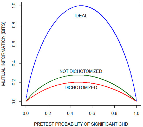 Figure 3 (reconstructed from their report with permission) compares mutual information as a function of pretest probability of significant CHD for the dichotomized and non-dichotomized approaches. The curve labeled IDEAL is the pretest diagnostic uncertainty as a function of pretest probability. It indicates the average amount of information that an ideal test would provide, i.e., the average amount of information needed to reduce the diagnostic uncertainty to zero (by yielding a posttest probability of either zero or one). We observe that, for most of the range of pre-test probabilities, approximately one third of the diagnostic information is lost by dichotomizing the results with a diagnostic cutoff of 1 mm. The issue of information lost as a consequence of dichotomizing test results is considered again in the following subsection.