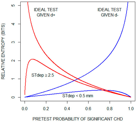 Diagnostic information (relative entropy) provided by the findings of an ST segment depression (STdep) < 0.5 mm and an ST depression (STdep) ≥ 2.5 mm as a function of pretest probability of significant coronary heart disease (CHD). Also shown are relative entropy plots for a theoretical ideal test when significant CHD is present (d+) and when significant CHD is absent (d). For the theoretical ideal test when significant CHD is present, relative entropy increases indefinitely as pretest probability of significant CHD approaches zero; and for the theoretical ideal test when significant CHD is absent, relative entropy increases indefinitely as pretest probability of significant CHD approaches one.