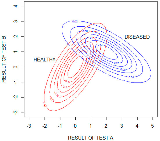 Contour plots showing the probability densities of the results of tests A and B for the healthy and diseased populations. The test results are expressed as standard deviations from the means of the distribution for healthy patients .
