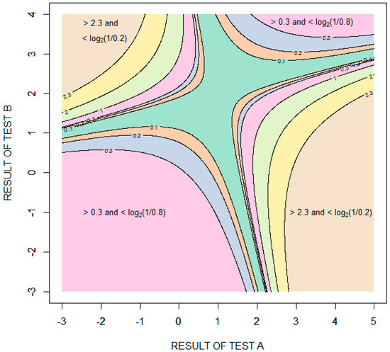 Let be the pretest probability of the -th disease state. Let be the probability of the -th disease state after performing test A and obtaining result . Let be the probability of the -th disease state after performing test B and obtaining result . Finally, let be the probability of the i-th disease state after performing both tests A and B and obtaining results and . The amount of information provided by test A for the subgroup of patients with result , as we saw in Section 3.2, is . Similarly, the amount of information provided by test B for the subgroup of patients with result is , and the amount of information provided by both tests for the subgroup of patients with results and is .