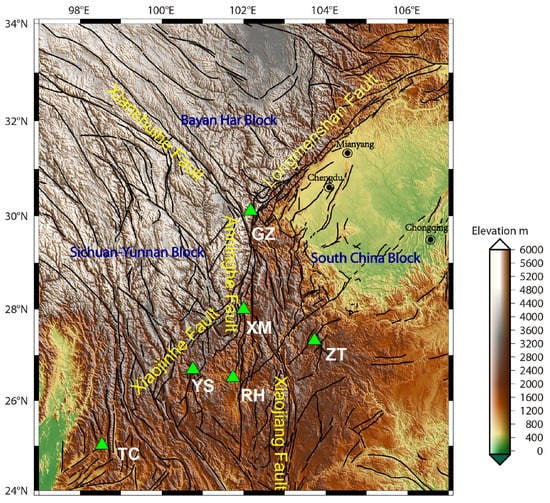 Map showing tectonic structure of the Sichuan-Yunnan region and the locations of the six borehole strain observation sites (green triangles). The black curves indicate the faults.